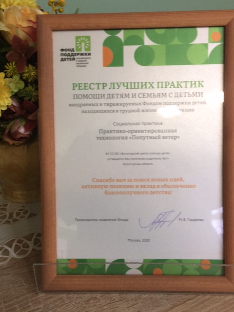 По итогам конкурса Лучших практик помощи детям и семьям с детьми, проведенного Фондом поддержки детей, находящихся в трудной жизненной ситуации, на Выставочной площадке Форума «Вместе ради детей» директору центра Н.Н. Шамаховой было вручено Свидетельство о внесении практико-ориентированной технологии «Попутный ветер» в Реестр лучших практик, внедряемых и тиражируемых Фондом.